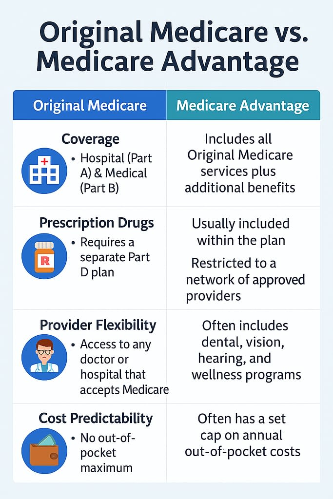 Medicare Advantage can be a good fit if you’re looking for bundled coverage with extra benefits and don’t mind staying within a network of providers. However, if you travel frequently or want to keep your current doctors, Original Medicare may be a better option.